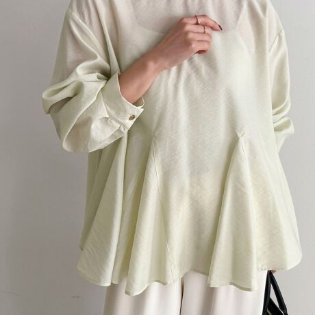 ・程よい透け感が軽やかな印象を与えるペプラムシルエットのシアーブラウス