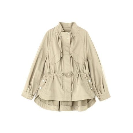 ナチュラルな表面感と軽さが魅力のツイル素材を使用したマウンテンパーカー。スタンドカラーはギャザー入りで顔まわりを柔らかく演出。ゆったりシルエットながらウエストスピンドルでメリハリをつけられ、後ろ身頃はヨーク切り替えからふんわり広がるフェミニンなラインに。前後差のあるヘムが軽やかさを添え、サイドのドットボタンやメタルパーツがアクセントの、機能性とデザイン性を兼ね備えた一着です。