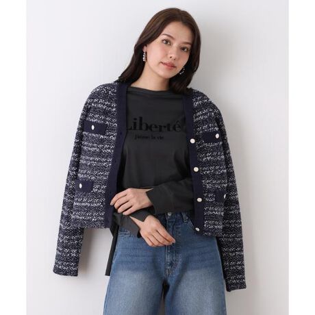 布帛のような上品な見た目のVネックニットツイードジャケット。襟元、前立て、ポケット口にあしらわれた共糸の無地使いがコントラストになり、洗練された印象を与えます。共糸のポケットを配には、メタルボタンが煌めきを添えます。軽やかな着心地ながらも、きちんと感を演出してくれるので、きれいめなお出かけから普段使いまで幅広く活躍。着るだけでコーディネートが華やぐ、大人の女性にぴったりの一枚です。