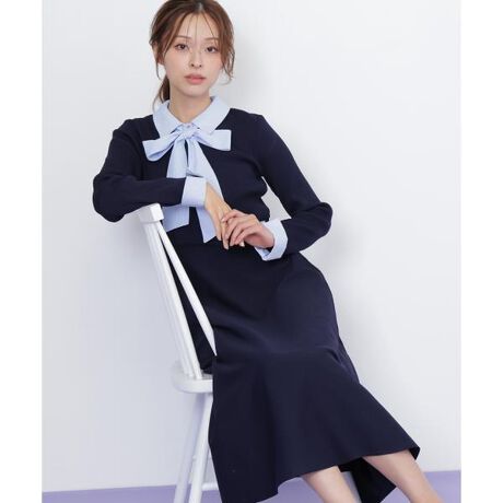 取り外しできるリボンタイ付きシャツ襟ニットワンピース。布帛のシャツ襟・カフス・大きいリボンタイと、ポリエステルの軽くてシルエットがキレイなニットをドッキングした1枚。リボンタイは取り外しできるため、オンオフで使い分けられるのが嬉しいポイント。襟できちんと感がありつつ、ニットで動きやすくなっているので新生活にもおすすめ。グレーとネイビーカラーのストライプ生地が春らしくて特におすすめです。※撮影時照明の関係により、色味が違って見える場合がございます。またパソコン・スマートフォンなどの環境により、若干製品と画像のカラーが異なる場合もございます。予めご了承ください。商品の色味は、商品単品画像をご参照下さい。※商品画像はサンプルのため、色味やサイズ等の仕様に変更がある場合がございますので、予めご了承ください。