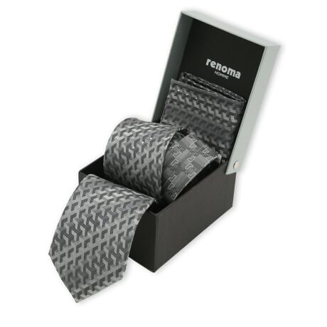 ギフトケースに入ったナロータイ&ポケットチーフセットです。大剣はグラデーションのジオメトリックパターン、小剣は「r」マークで切り替えたデザイン。さりげないラインストーンがお洒落なアクセントになっています。モードな雰囲気が漂うナロータイが、センスの光る衿元を演出してくれます。パッケージケースにもこだわったデザインなので、大切な方の誕生日や記念日のプレゼントとしてもおすすめです。