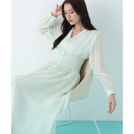 表情豊かな素材感が魅力のワンピース。顔まわりをすっきりと見せるVネックラインに、ギャザーとタックディテールを組み合わせることでトップス部分に柔らかなニュアンスを添えて、ウエストから裾にかけてたっぷりと広がるシルエットが、女性らしい軽やかさを引き立てます。ウエストに施したゴムシャーリングがシルエットを美しく整えながら、フェミニンな印象をプラス。ほどよい透け感のある軽やかな素材が、動くたびに揺れ感を生み出し、装いに軽さと華やぎを添える一枚です。