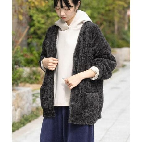 ニットは帝人フロンティアの主にアウトドア衣料に使用されているOCTA素材を使用。柔らかい毛足のシャギーヤーンで軽量ですがバルキーな嵩高性が特徴です。EKALのロゴ入りプランサーを使用しており、左袖口にはEKALの刺繍を施し特別感を。秋冬らしい素材感とオーバーサイズのカーディガンでシーズンムードを格上げしてくれる1枚です。