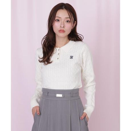 エポ金色ボタンが上品なポロ襟ニット。綿混の糸を使用したケーブル柄は凹凸がくっきりと出て、ほどよくカジュアルなタッチのニットになっています。襟もニットなので、様々なボトムスと合わせやすいデザイン。春らしいカラー展開もポイントで、コーディネートを新鮮に見せてくれます。※撮影時照明の関係により、色味が違って見える場合がございます。またパソコン・スマートフォンなどの環境により、若干製品と画像のカラーが異なる場合もございます。予めご了承ください。商品の色味は、商品単品画像をご参照下さい。※商品画像はサンプルのため、色味やサイズ等の仕様に変更がある場合がございますので、予めご了承ください。