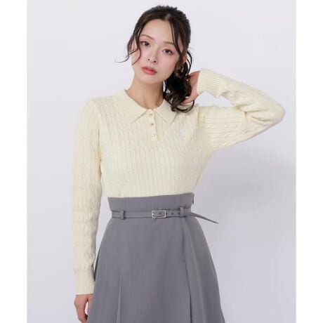 エポ金色ボタンが上品なポロ襟ニット。綿混の糸を使用したケーブル柄は凹凸がくっきりと出て、ほどよくカジュアルなタッチのニットになっています。襟もニットなので、様々なボトムスと合わせやすいデザイン。春らしいカラー展開もポイントで、コーディネートを新鮮に見せてくれます。※撮影時照明の関係により、色味が違って見える場合がございます。またパソコン・スマートフォンなどの環境により、若干製品と画像のカラーが異なる場合もございます。予めご了承ください。商品の色味は、商品単品画像をご参照下さい。※商品画像はサンプルのため、色味やサイズ等の仕様に変更がある場合がございますので、予めご了承ください。
