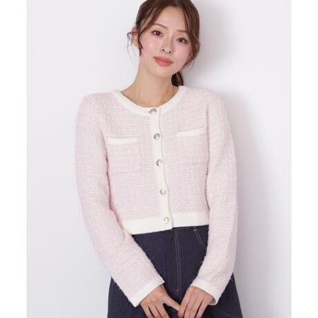 ミックスツイード風の編地が華やかな雰囲気のニットジャケット。ほどよい厚みで軽く羽織れるのに高級感があり、シンプルなワンピースやボトムスと合わせるだけでコーデを格上げしてくれます。柔らかい着心地ながらも、きちんと感とフェミニンさを兼ね備えた万能羽織りです。※撮影時照明の関係により、色味が違って見える場合がございます。またパソコン・スマートフォンなどの環境により、若干製品と画像のカラーが異なる場合もございます。予めご了承ください。商品の色味は、商品単品画像をご参照下さい。※商品画像はサンプルのため、色味やサイズ等の仕様に変更がある場合がございますので、予めご了承ください。
