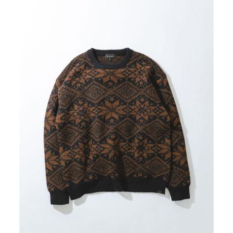 オリジナルの雪柄を全体に用いたクルーネックデザインのニットプルオーバー。 ゆったりとしたリラックス感のあるサイジング。毛足のある糸を用いることで奥行きのある柄の表現をし、大人っぽい印象に仕上げています。 カラーは黒とブラウンの組み合わせと黒と赤の組み合わせで作成。秋冬ならではの温かみのある二色展開でご用意いたしました。