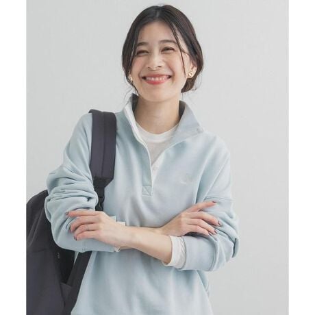 首元をすっきりと見せるスタンドカラーのスウェットは、カジュアルながらも上品な印象を与える一着。
