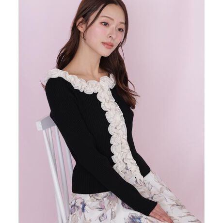 衿ぐりと前立てにシフォンのボリュームフリルをトリミングした華やかなニット。細身でほど良くフィットするリブニットと布帛フリルのコントラストがポイント。ほど良いデコルテ開きで首元をキレイに見せつつ、フリルにボリュームがあるので肩紐を気にしないで着られます。バイカラーの配色ブラックと、同色系でまとめたエクリュとピンクカラーも華やかで春のコーディネートにおすすめです。※撮影時照明の関係により、色味が違って見える場合がございます。またパソコン・スマートフォンなどの環境により、若干製品と画像のカラーが異なる場合もございます。予めご了承ください。商品の色味は、商品単品画像をご参照下さい。※商品画像はサンプルのため、色味やサイズ等の仕様に変更がある場合がございますので、予めご了承ください。