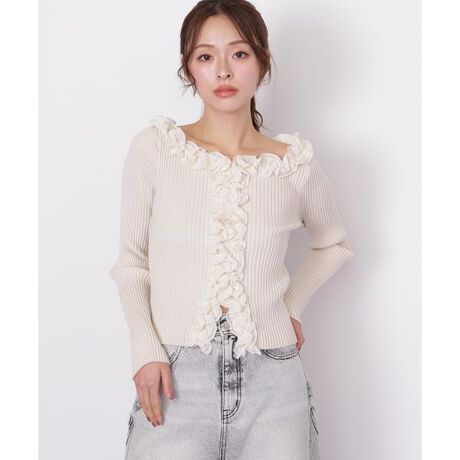 衿ぐりと前立てにシフォンのボリュームフリルをトリミングした華やかなニット。細身でほど良くフィットするリブニットと布帛フリルのコントラストがポイント。ほど良いデコルテ開きで首元をキレイに見せつつ、フリルにボリュームがあるので肩紐を気にしないで着られます。バイカラーの配色ブラックと、同色系でまとめたエクリュとピンクカラーも華やかで春のコーディネートにおすすめです。※撮影時照明の関係により、色味が違って見える場合がございます。またパソコン・スマートフォンなどの環境により、若干製品と画像のカラーが異なる場合もございます。予めご了承ください。商品の色味は、商品単品画像をご参照下さい。※商品画像はサンプルのため、色味やサイズ等の仕様に変更がある場合がございますので、予めご了承ください。