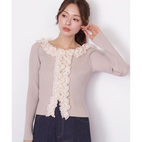衿ぐりと前立てにシフォンのボリュームフリルをトリミングした華やかなニット。細身でほど良くフィットするリブニットと布帛フリルのコントラストがポイント。ほど良いデコルテ開きで首元をキレイに見せつつ、フリルにボリュームがあるので肩紐を気にしないで着られます。バイカラーの配色ブラックと、同色系でまとめたエクリュとピンクカラーも華やかで春のコーディネートにおすすめです。※撮影時照明の関係により、色味が違って見える場合がございます。またパソコン・スマートフォンなどの環境により、若干製品と画像のカラーが異なる場合もございます。予めご了承ください。商品の色味は、商品単品画像をご参照下さい。※商品画像はサンプルのため、色味やサイズ等の仕様に変更がある場合がございますので、予めご了承ください。
