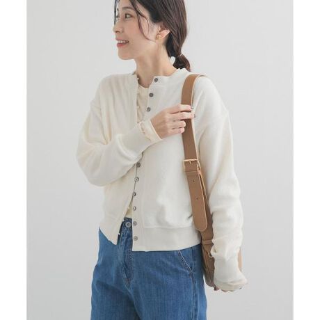 ふんわりと柔らかく軽い裏起毛のブークレ生地を使用した、着心地の良いカットショートカーデ。