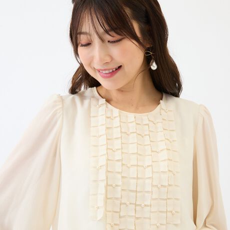 ・軽やかな透け感にタックプリーツとパールビーズの甘いディティールがおとな可愛い印象