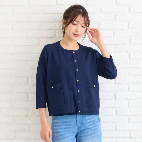 ・小さな花の形のボタンと両サイドのポケットが、さりげなく華やかさを添えるポイント