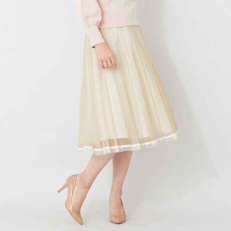 ウエストはゴム仕様で快適な履き心地のプリーツスカートです。裾には配色のトーションレースとチュールを切り替えであしらい、軽やかで華やかな印象に仕上げました。透け感と動きのあるプリーツが、コーディネートを一層引き立てます。