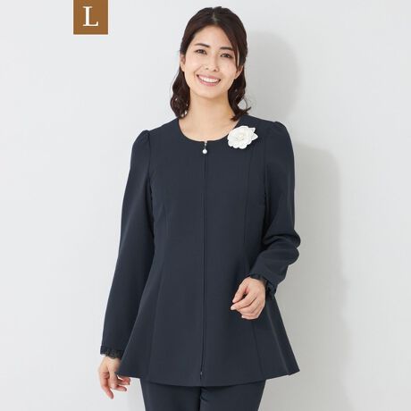 ショルダーラインからバストラインにかけて切り替えを入れることで、胸元に立体感と自然なボリュームを出し、美しいシルエットを表現しています。裾に向かってフレアーを施すことで、ヒップラインをさりげなくカバーできるデザインです。フロントは上下スライダー仕様で、下側を開けることでシルエットの変化も楽しめます。袖口には取り外し可能なケミカルレースをあしらい、華やかさをプラスしています。