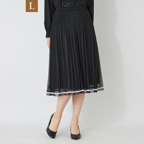 ウエストはゴム仕様で快適な履き心地のプリーツスカートです。裾には配色のトーションレースとチュールを切り替えであしらい、軽やかで華やかな印象に仕上げました。透け感と動きのあるプリーツが、コーディネートを一層引き立てます。