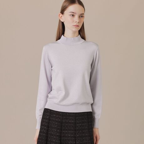 ハイネックのニットトップスです。ラメの艶感を活かした鮮やかなニットで、顔周りが華やかな印象になります。また、体のラインを拾いにくいシルエットで、インナーとしても1枚で着てもさまざまなコーディネートに活躍するアイテムです。シンプルながら計算された丈感で同素材のカーディガン(品番:G5N52731)のインナーとして、アンサンブルでも着用いただけます。
