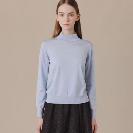 ハイネックのニットトップスです。ラメの艶感を活かした鮮やかなニットで、顔周りが華やかな印象になります。また、体のラインを拾いにくいシルエットで、インナーとしても1枚で着てもさまざまなコーディネートに活躍するアイテムです。シンプルながら計算された丈感で同素材のカーディガン(品番:G5N52731)のインナーとして、アンサンブルでも着用いただけます。