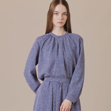 衿ぐりに寄せたタック&ギャザーが生み出すエアリーなフォルムで、クラシカルな雰囲気に仕上げたブラウスです。一枚着はもちろんジャケットのインナーなど、季節に合わせたコーディネートを楽しめるアイテムです。同素材のスカート(品番:G5S67706)もご用意しております。