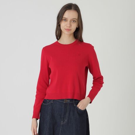 [型番:55N03709__]◆胸元刺しゅうがアクセントのニットプルオーバー【Design】胸元にブランドアイコンの刺しゅうをあしらったクルーネックニットプルオーバーです。綿混素材を使用した、軽やかながらふっくら感もある着心地が魅力のニットアイテムです。ダークネイビーと白のボーダー、バイカラー、そしてソリッドのイエロー、レッドと楽しい色展開で作りました。