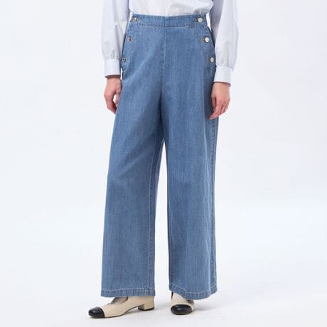 毎シーズン好評のコットンリネンデニムシリーズのマリンパンツ。ヒップ周りはすっきりと、裾にかけてワイドストレートシルエットで、体型を拾いにくくすっきり見せてくれます。ネオバ釦のマリンディテールとデニムの相性が新鮮な表情で、シンプルなトップス合わせでも華やかなスタイリングに。