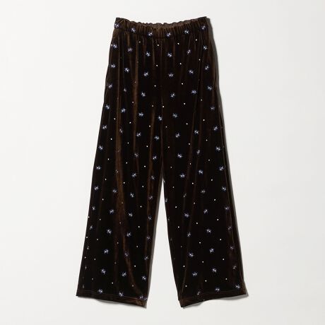 ベロアの光沢と刺繍が目をひくイージーパンツ。