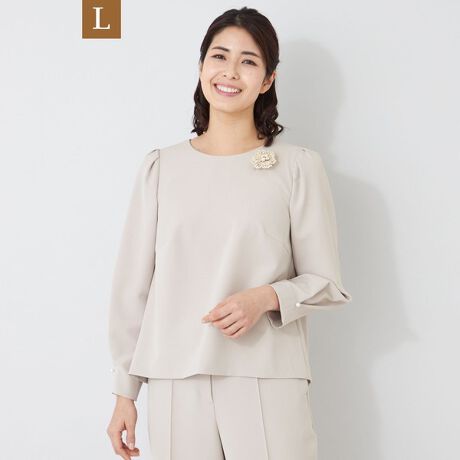 ボックスシルエットのショートブラウスで、フロントはシンプルでスッキリとしたデザインに仕上げています。バックスタイルは、中心にボックスタックを施し、奥に裾スカラップ付きのラッセルレースを挟み込むことで、後ろ姿に上品なアクセントをプラスしました。袖口にはタックを寄せ、ポイントとしてパールボタンをあしらい、上品な印象を演出しています。