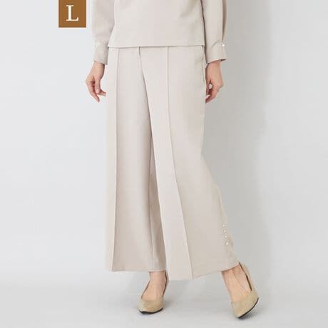 フロントにセンターつまみピンタックを施し、縦のラインを強調することで脚長効果を演出しています。ノータック仕様で腰まわりがすっきりと見える、上品なワイドパンツです。裾の脇にはパールとラインストーンのビジューパーツを施し、さりげない華やかさを添えています。