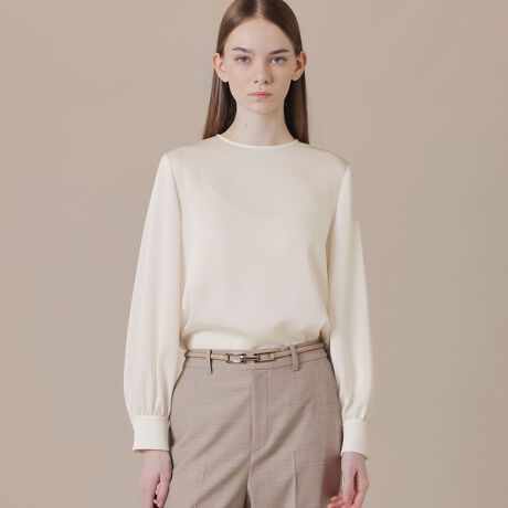 すっきりとしたボディにボリュームを持たせたパフスリーブがポイントのブラウスです。オンオフ問わず着用できるクリーンな表情のアイテムです。