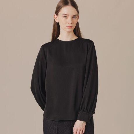 すっきりとしたボディにボリュームを持たせたパフスリーブがポイントのブラウスです。オンオフ問わず着用できるクリーンな表情のアイテムです。