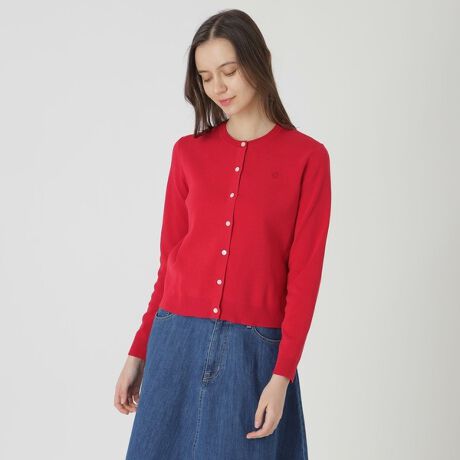 [型番:55N02709__]◆胸元刺しゅうがアクセントのクルーネックカーディガン【Design】胸元にブランドアイコンの刺しゅうをあしらったクルーネックカーディガンです。綿混素材を使用した、軽やかながらふっくら感もある着心地が魅力のニットアイテムです。ダークネイビーと白のボーダー、バイカラー、そしてソリッドのイエロー、レッドと楽しい色展開で作りました。