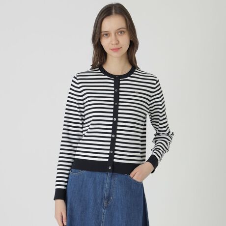 [型番:55N02709__]◆胸元刺しゅうがアクセントのクルーネックカーディガン【Design】胸元にブランドアイコンの刺しゅうをあしらったクルーネックカーディガンです。綿混素材を使用した、軽やかながらふっくら感もある着心地が魅力のニットアイテムです。ダークネイビーと白のボーダー、バイカラー、そしてソリッドのイエロー、レッドと楽しい色展開で作りました。