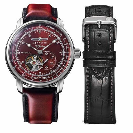 ダイヤルには2種類のスケールを採用。タキメーターは航続可能距離を計測するため、テレメーターは雷雲のある場所を推測するために用いられたもので、いずれも飛行船が安全に飛行するためのものです。中央にはドイツ語で「100周年」を意味する「100Jahre」の文字も入っています。