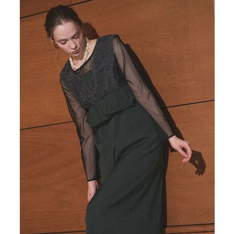 チュールの華やかさと立体感のあるシルエットが魅力のドレスとシアートップスのセットアイテム。