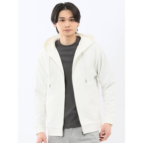 シンプルなデザインで着回しやすい、長袖のフルジップパーカーです。凹凸感のあるふくれジャガード(ツイル)で高見えするルックスに仕上げています。すっきりとしたシームポケット付きで利便性にも優れています。
