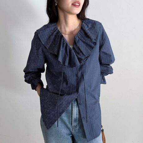 顔まわりを華やかに彩る、チェックフリルカラーブラウス