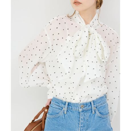 ・結び方次第で顔回りの印象に変化を出せるボウタイブラウス。