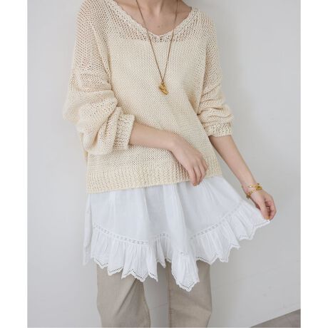 素材感:ローゲージでインナーが透けるようなニット素材。