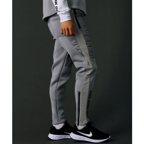 ジップポケットの引手やウエストの内側部分の紐、左太腿と両側のふくらはぎにロゴを入れ、左後ろにはスタンプのように押されたラバー製のロゴを配し、デザイン性を高めました。美脚見せできるように裾に向かって細く窄めたテーパードシルエットを採用し、脱ぎ穿きしやすさを考慮して裾のサイドにジップも付けました。足が通しやすくなるだけでなく、着こなしのアクセントにご利用いただくこともできるディテールです。暖かさと穿き心地、デザイン性兼ね備えた、スポーツシーンに適したパンツになっております。