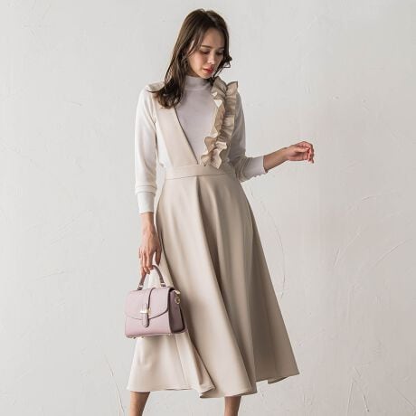 レイヤードスタイルを華やかに昇華してくれるジャンパースカートはフリルデザインで印象的に。