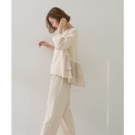 バックフリルをあしらったブラウスと、すっきり見えるストレートパンツのセットアップ。