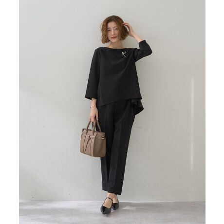 バックフリルをあしらったブラウスと、すっきり見えるストレートパンツのセットアップ。