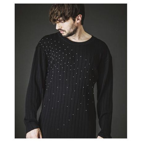 スタッズの軌跡で描く“流れ星”のモチーフがポイントとなり、シンプルなニットに立体的な陰影とアクセントをプラス。レギュラーフィットの程よいサイズ感とリブニットのフィット性が、1枚でもインナー使いでも美しくまとまり、秋冬のモードスタイルに扱いやすい一着となっている。