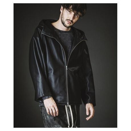 シンセティックレザーのスムースとクロコダイル型押しを組み合わせた、春先に最適なフーデッドブルゾン。