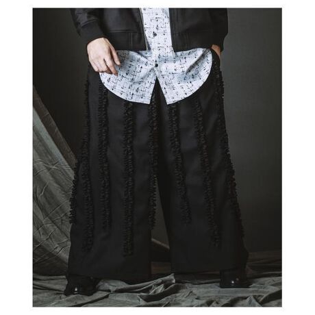 動きに合わせて揺れるフリルが独特のリズムと立体感を生み、中性的かつエッジの効いたモードシルエットを形成。ウエストはゴム+ベルトループ仕様でサイズ調整の幅が広く、見た目の個性に対して着心地はストレスフリー。