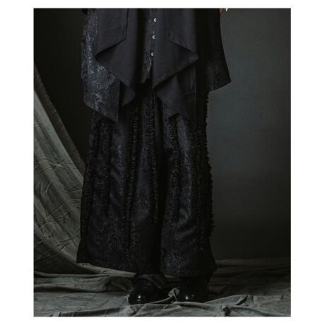動きに合わせて揺れるフリルが独特のリズムと立体感を生み、中性的かつエッジの効いたモードシルエットを形成。ウエストはゴム+ベルトループ仕様でサイズ調整の幅が広く、見た目の個性に対して着心地はストレスフリー。