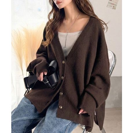 多重編みで厚みと保温性を備えたオーバーサイズVネックカーデ。