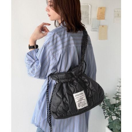 ふんわりしたパフィ素材でハンドルで腕が痛くなりにくく、口元コードで巾着風にシルエット変化が可能です。
