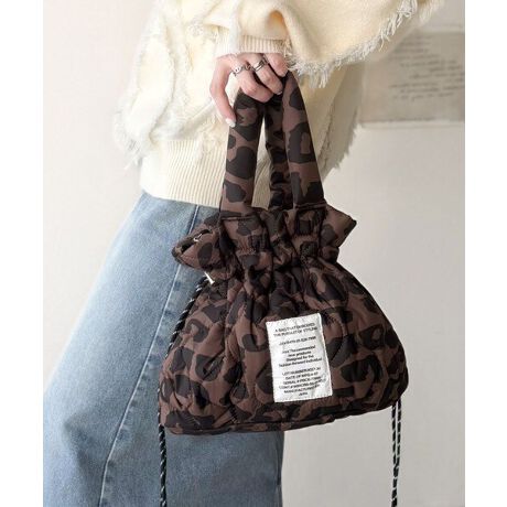 ふんわりしたパフィ素材でハンドルで腕が痛くなりにくく、口元コードで巾着風にシルエット変化が可能です。